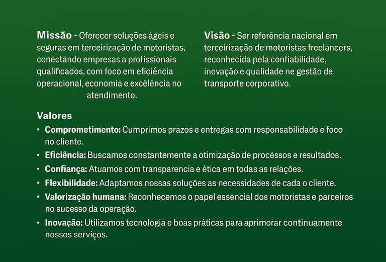 Há mais de 10 anos, fornecendo soluções ágeis e seguras em terceirização de motoristas freelancer, conectando empresas a profissionais qualificados, com foco em eficiência operacional, economia e excelência no atendimento.